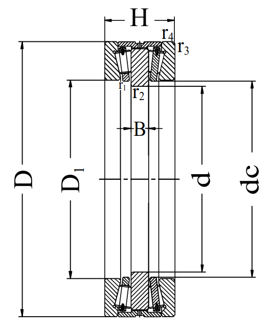 推力圓錐滾子軸承與四點角接觸球軸承的結構相似同樣有雙半內圈整體外圈及雙半外圈整體內圈的結構,但不可分離。能承受較大的徑向負荷為主的徑向和軸向聯合負荷和力矩負荷,限制軸的兩方面的軸向位移。主要用于限制軸和外殼雙向軸向位移,雖然軸承可承受雙向軸向載荷,但若一側有裝球缺口時,則應注意不要讓主要軸向載荷通過有缺口的一側溝邊。在軸承使用時應注意使不帶裝球缺口的一側滾道承受主要載荷。